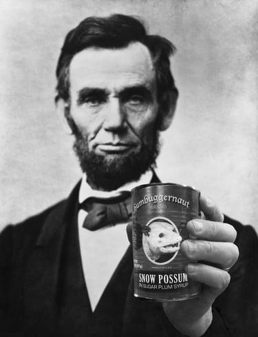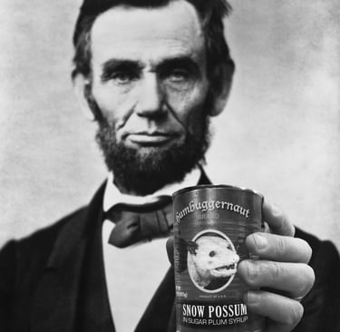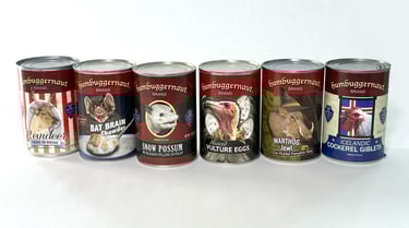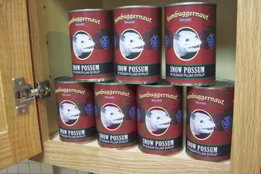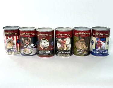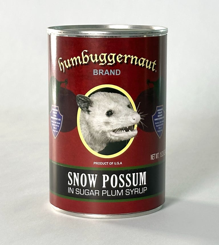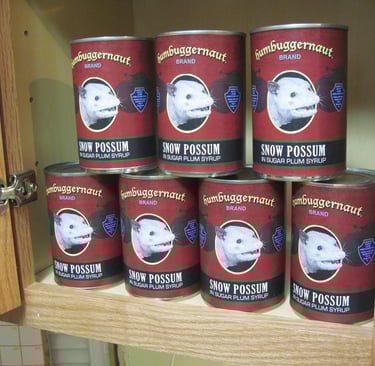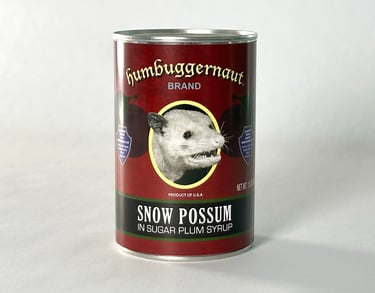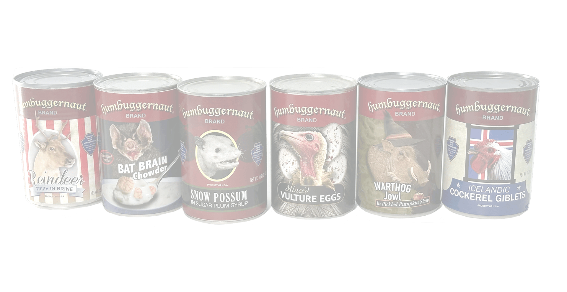 It all started with a can of 'Possum. Twelve years ago, as just a fun gag to give to neighbors and family, a can of Snow Possum was designed, and printed at the local print shop. Carefully cutting the label out, and glueing it to a vegetable can, the fun all started. We created the HUMBUGGERNAUT BRAND envisioning some guy named Johann Humbuggernaut in South Dakota, churning out bad canned food with questionable flavors. Things have come a long way.